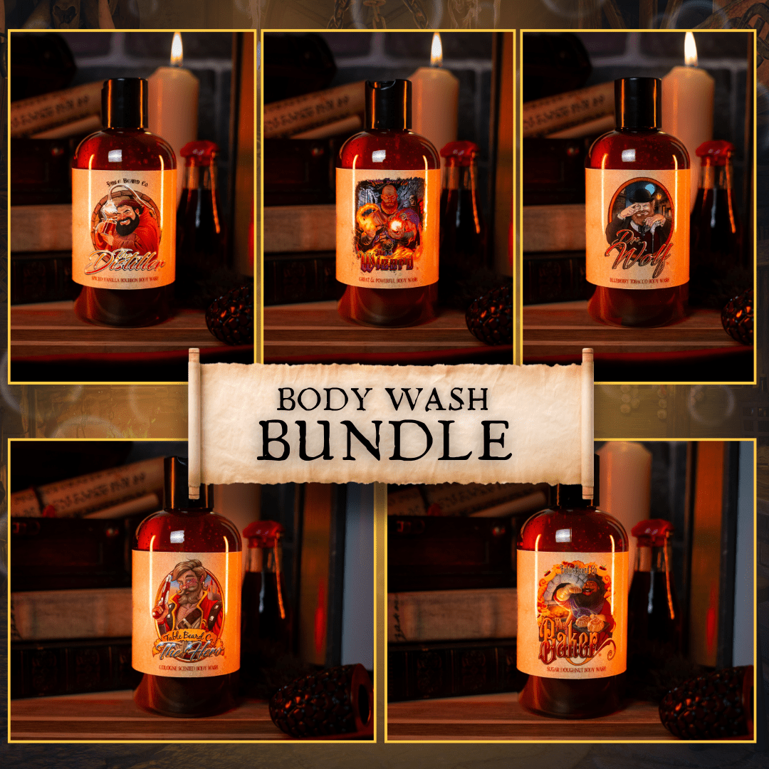 Step out of the shower and into the story with Fable Beard Co.'s Body Wash Bundle—a collection of five 8oz bottles, each inspired by a fan-favorite character. From bourbon-soaked brews to mystical fruits and warm woods, every wash is a journey through scent and lore.