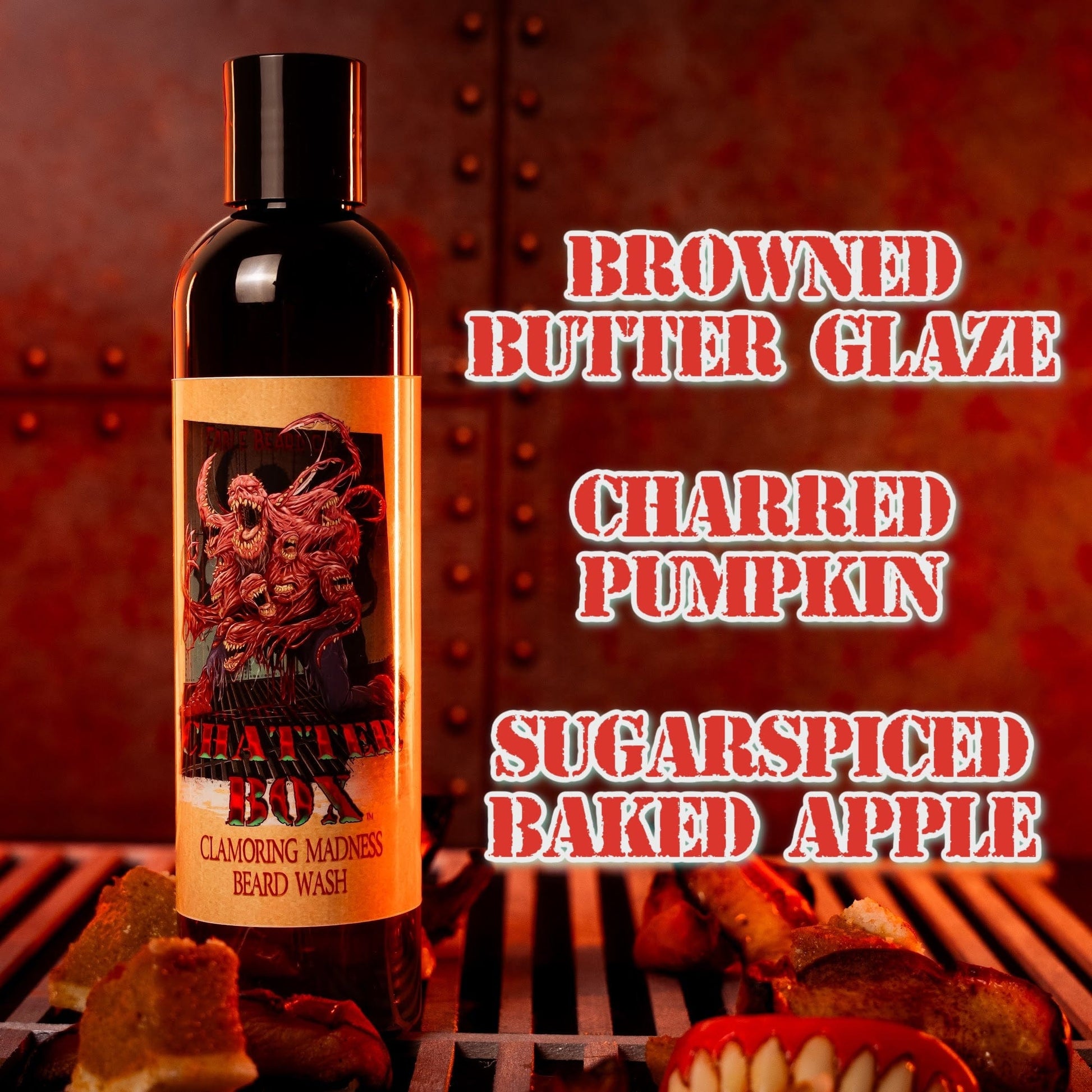 He lived in silence once—voice trapped, words unspoken, torment rotting inside. But silence breeds madness. In death, Chatterbox’s screams never cease, clawing through eternity with every breath you take. His scent rises like a twisted hymn—warm browned butter glaze dripping with false comfort, charred pumpkin sugar smoldering with rage, and spiced baked apple crackling like fire in the night. A wash not of peace, but of release.