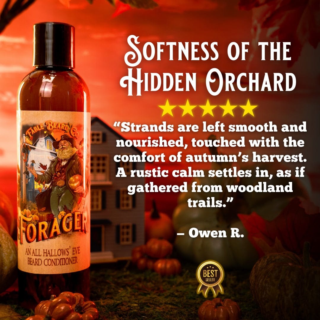 When the day’s wanderings are done, The Forager returns home—boots dusted with leaves, hands scented with cider, and heart full of autumn’s treasures. By the firelight, he tends his beard with the same care he gives to the harvest, restoring what the day has taken. His conditioner softens, hydrates, and strengthens, wrapping every strand in the sweetness of maple glaze, the buttery richness of praline, and the spiced comfort of mulled cider.