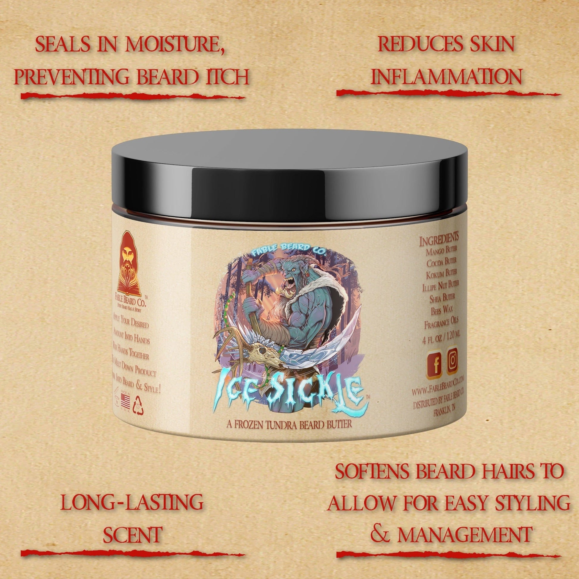Ice Sickle Beard Butter is crafted with five elite butters to deeply condition, strengthen, and protect your beard through even the coldest nights.