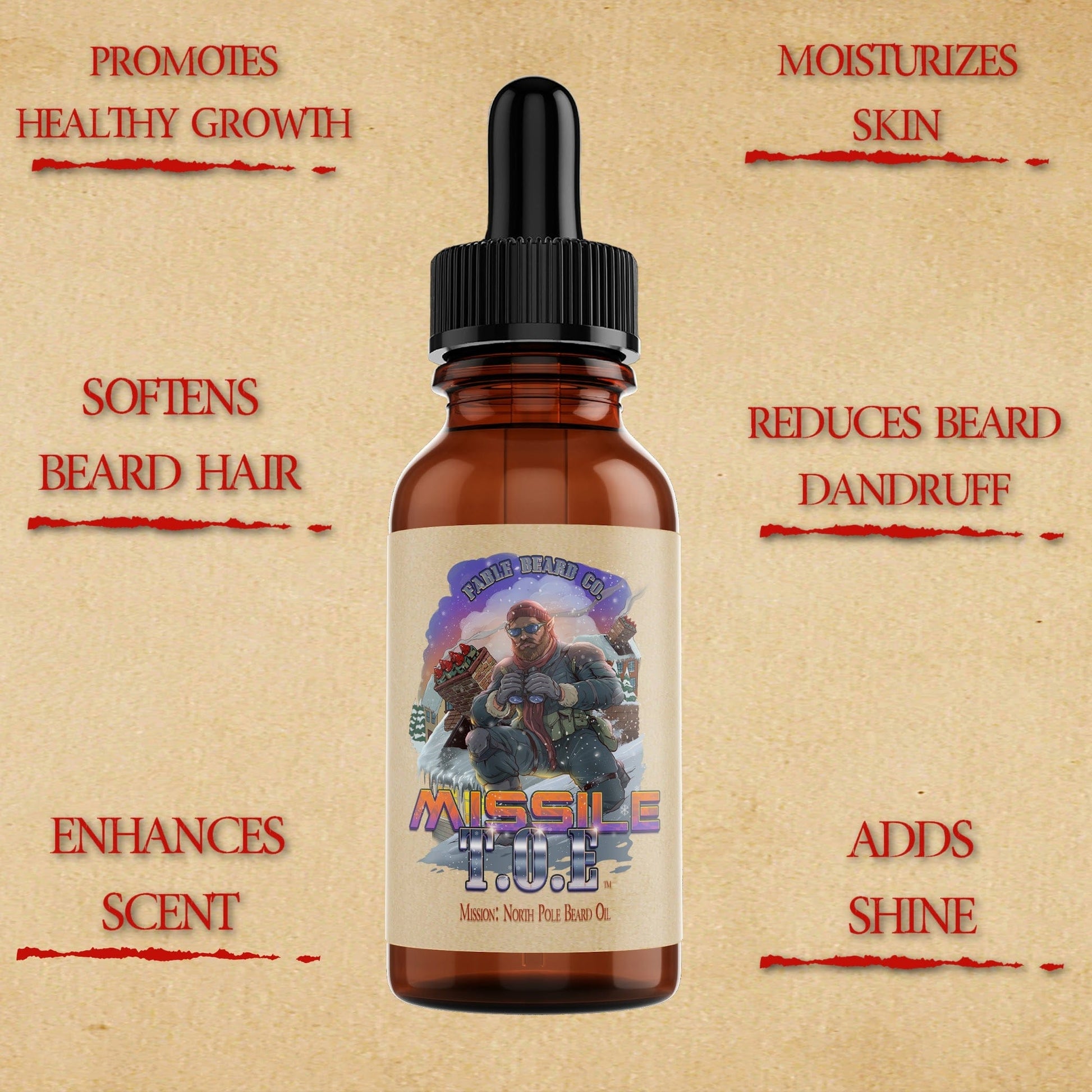 When the frost creeps close to Santaās gates, Missile Toe answers the call. The North Poleās elite heavy munitions expert, he stands guard over holiday magic with steady aim and unshakable resolve. Every drop of this beard oil embodies his missionāfortifying your beard, shielding your skin, and surrounding you with the bold, confident scent of winterās might.