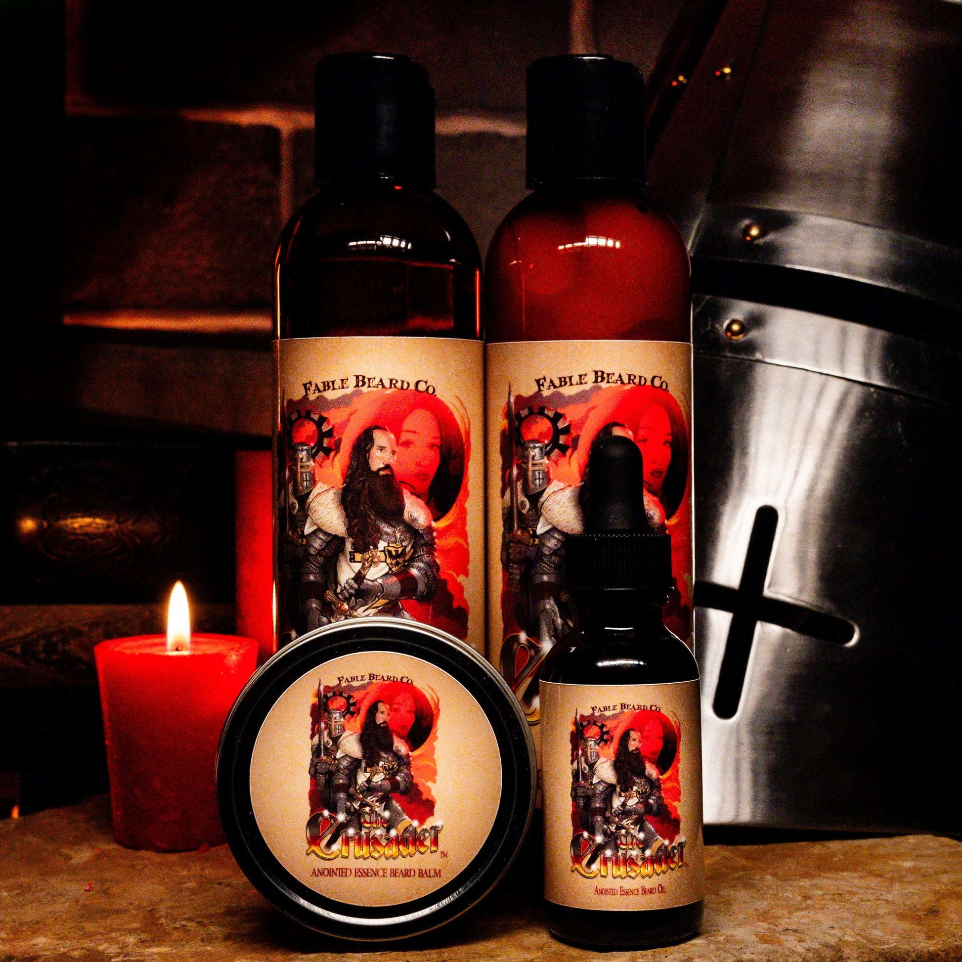 Elevate your grooming routine with Fable Beard Co.'s Complete Beard Care Kit, now featuring The Crusader, a scent that embodies valor, resilience, and the unwavering spirit of a noble warrior. This all-in-one kit is designed to keep your beard healthy and impeccably groomed, infused with the bold, commanding notes of Ancient Citrus Musk, Lavender Soaked Sandalwood, and Eucalyptus Spice.