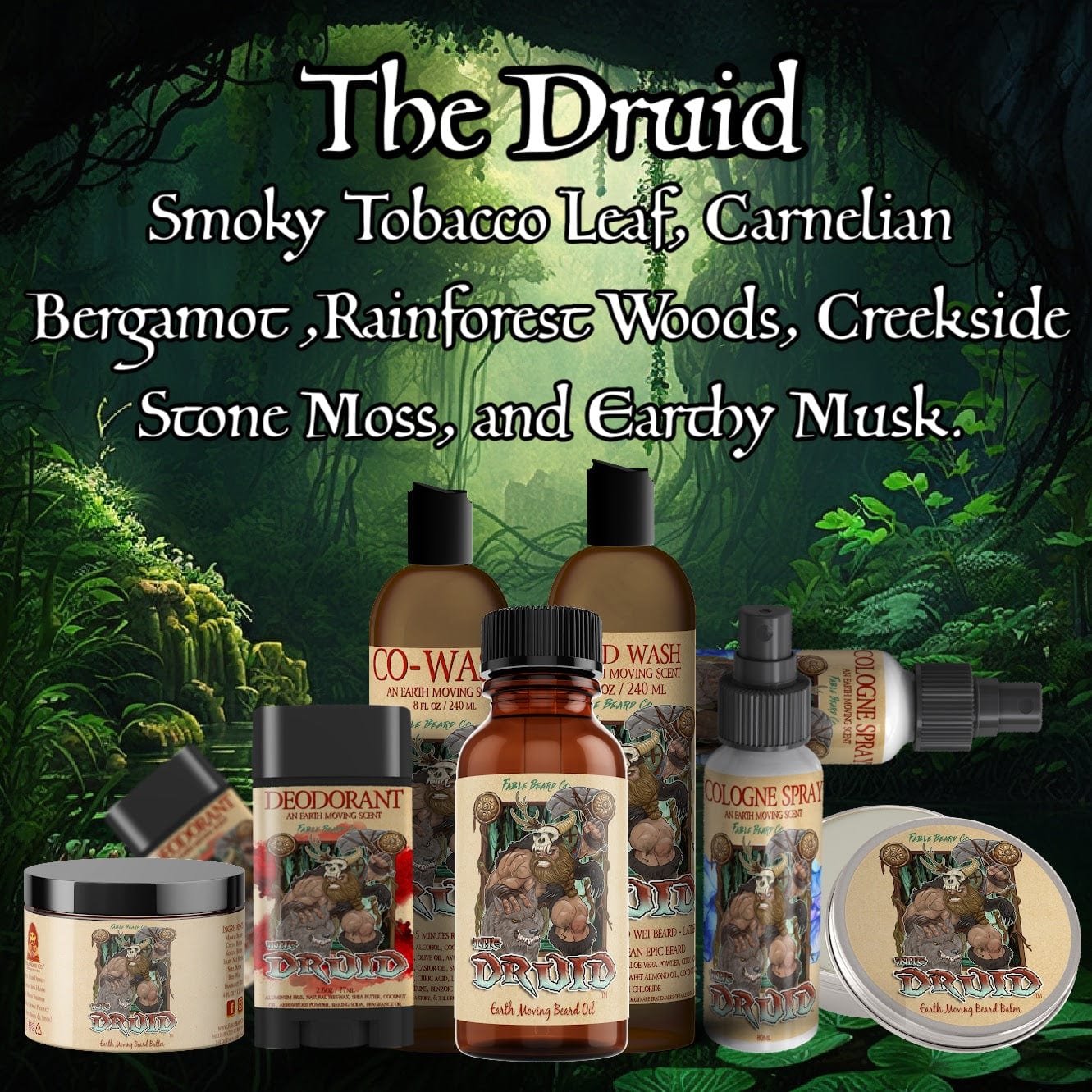 The Druid - Smoky Tobacco Leaf, Carnelian Bergamot, Rainforest Woods, Creekside Stone Moss, and Earthy Musk.