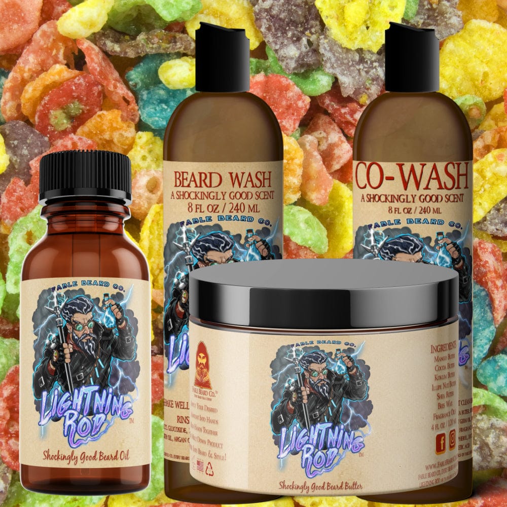 Lightning Rod's superhero-themed beard products offer a scent profile of Fruity Cereal, Crisp Lemon, Fresh Cherries, and Sweet Pomegranate. The Fruity Cereal scent is sweet and nostalgic, while the Crisp Lemon is fresh and invigorating. The Fresh Cherries and Sweet Pomegranate scents are both fruity and sweet, rounding out a delightful and unique fragrance collection.