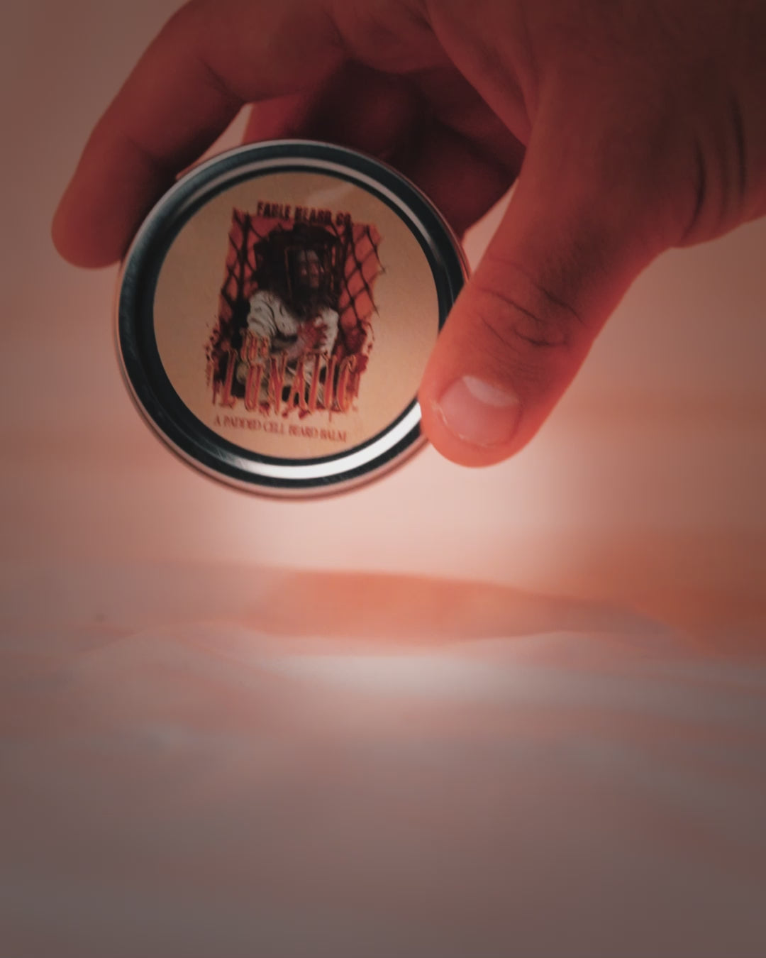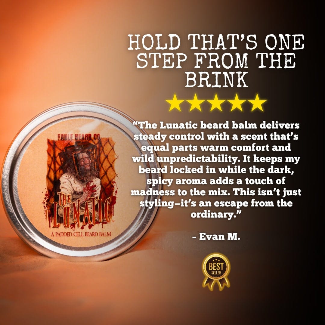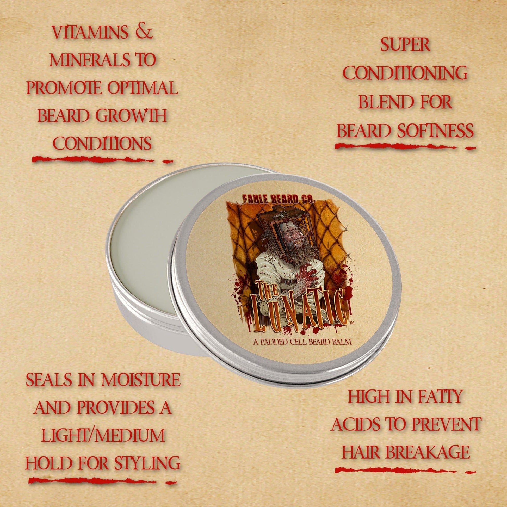 The Lunatic Beard Balm is crafted to shape, hydrate, and control while enveloping your beard in a scent that whispers your name from the void.