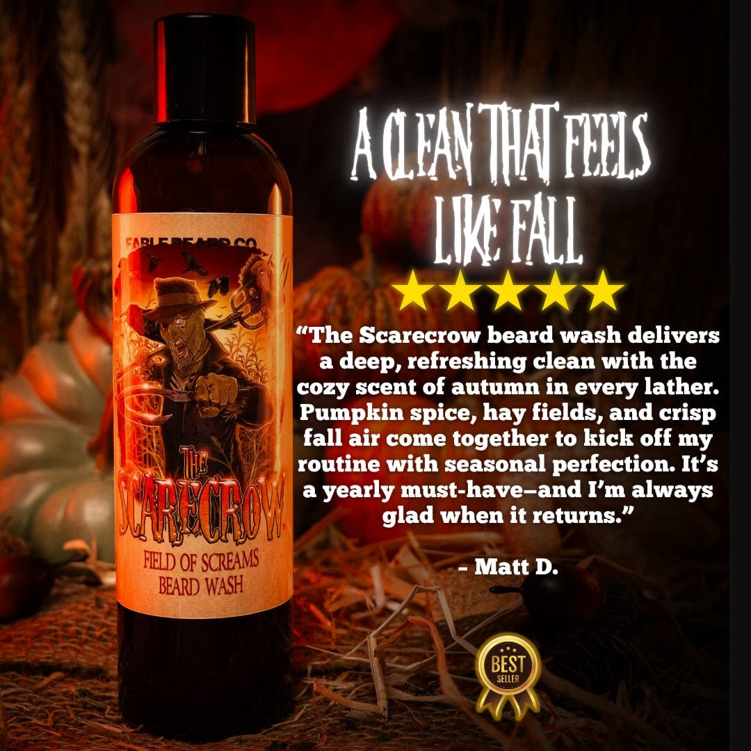Whether you're envisioning haunted fields or simply looking to add a touch of spooky charm to your daily routine, The Scarecrow is your perfect companion. Unleash the eerie spirit of the harvest season with Fable Beard Co.'s The Scarecrow and let your beard journey begin.