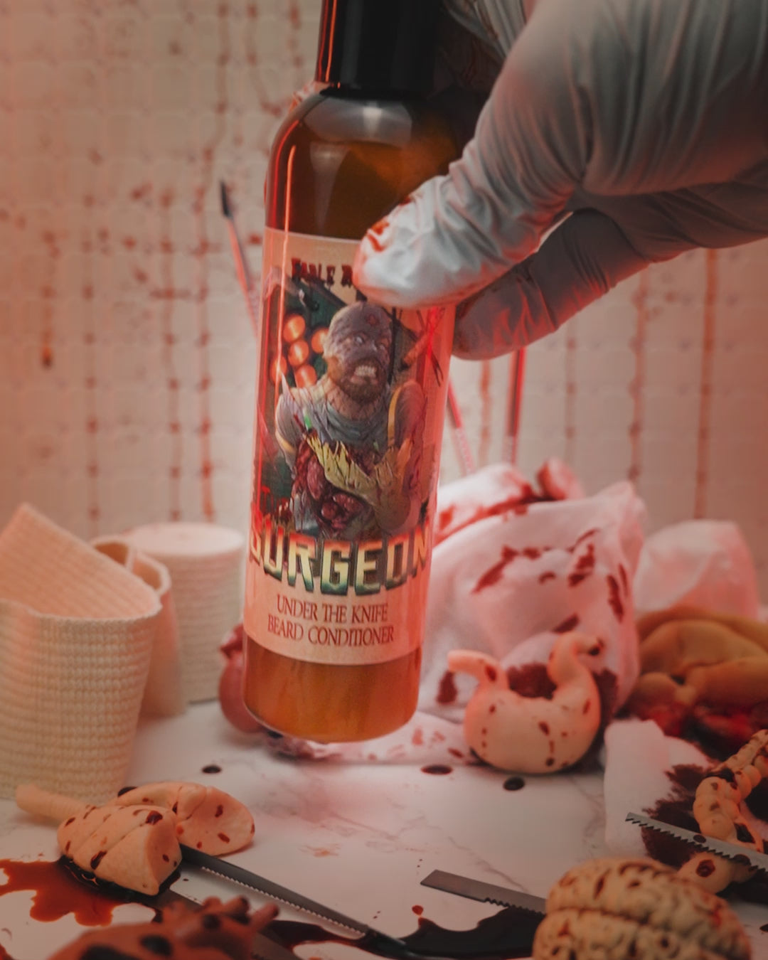 He once swore to heal, but obsession sharpened his oath into madness. With a glove of knives and needles, The Surgeon carved not cures, but scars. Death could not end his practice—his work continues in eternity, every rinse echoing the bitter austerity of black tea leaves, the sterile sting of lemon tincture, and the heavy dread of cursed amberwood. Each wash softens the edge, restores strength, and binds your beard beneath the blade.